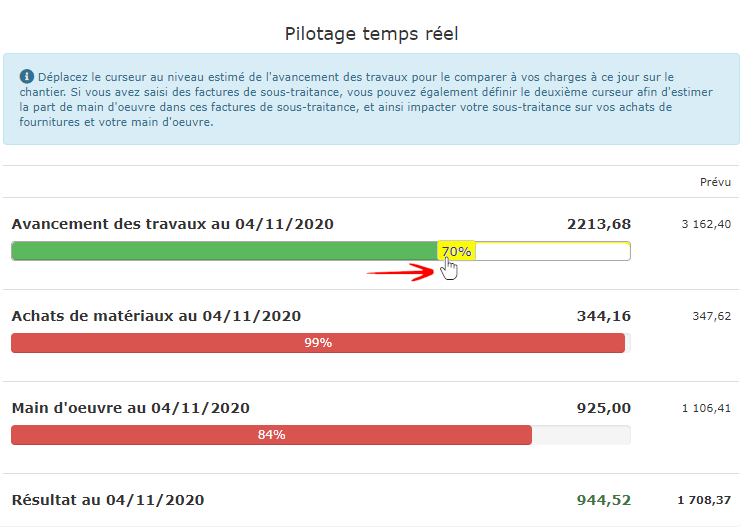 Sur l'exemple ci-dessus, nous voulons estimer la rentabilité du chantier avec un avancement à 70%, simplement en déplaçant le premier curseur.
