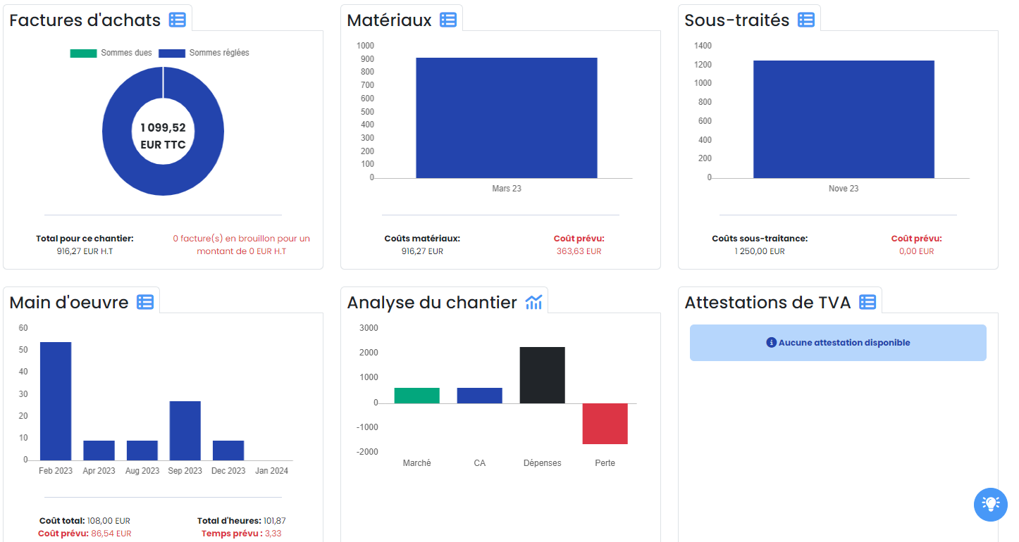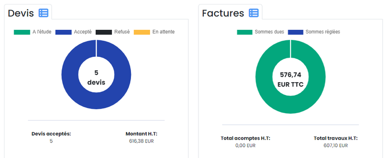 - Consultez en un clin d'œil, le montant des devis acceptés pour ce chantier, le chiffre d'affaires réalisé à ce jour, et l'état des règlements par exemple 👍