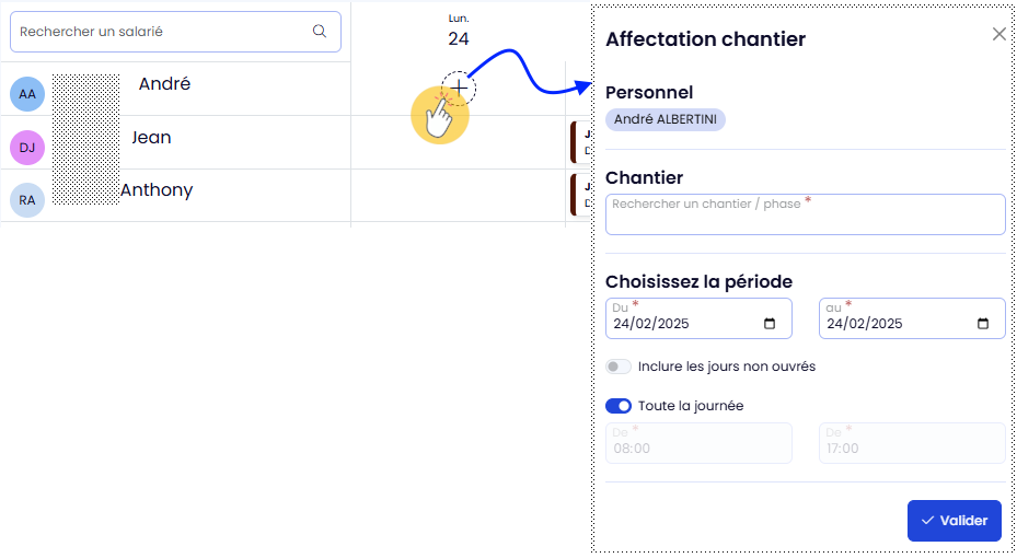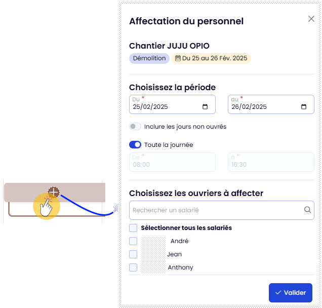 Sélectionnez les personnes affectée à la phase de chantier, pour la période sélectionnée.