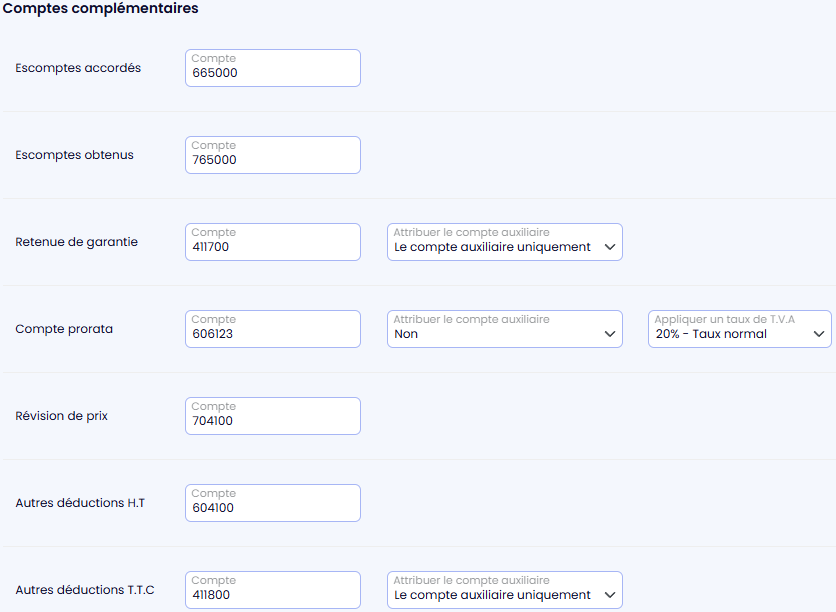 Saisissez ici les comptes comptables correspondant aux différentes majorations / déductions sur factures.