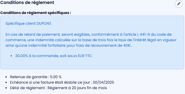 - Vous pouvez définir des conditions de règlement spécifiques à un client, qui seront appliquées automatiquement au devis lorsque vous choisirez ce client.