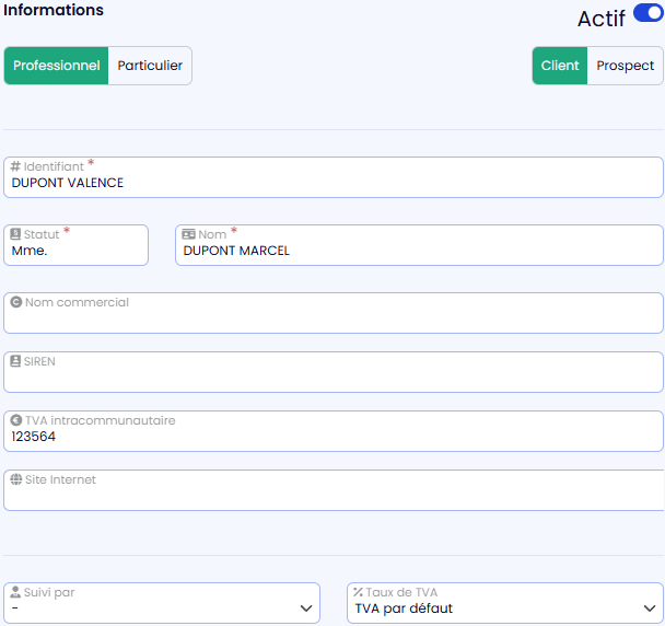 Pensez à saisir cette information pour vos clients professionnels. ⚡ Si le SIREN n'est pas saisi et que le client est un professionnel, vous ne pourrez pas [ finaliser ses factures](../../devis-factures/factures/finaliser-et-envoyer-une-facture) .Suivi par