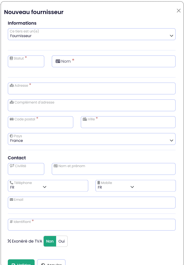 Coordonnées du fournisseur Renseignez l'adresse, les coordonnes téléphoniques et mail. Vous pourrez compléter l'adresse plus tard si vous ne la connaissez pas, seuls le code postal et la ville sont obligatoires.