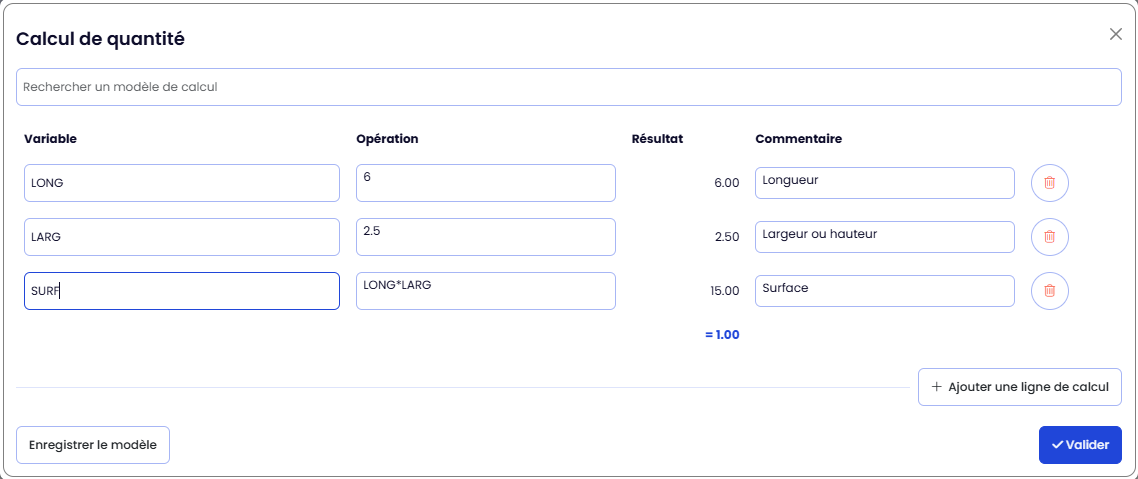 - Utilisez ou créez des modèles de calculs, aussi appelés "minutes de calcul", offrant des possibilités très avancées, et permettant de conserver les opérations réalisées pour obtenir la quantité saisie dans le devis.