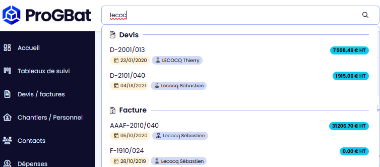 - Tapez quelques lettres du nom du client, du nom du chantier, ou du numéro du devis, et cliquez sur le résultat souhaité.