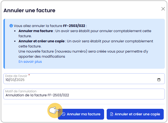 ## ⚡ Important * L'avoir sera créé et finalisé automatiquement, vous ne pourrez y apporter aucune modification. * L'action est irréversible, il ne sera pas possible d'annuler une annulation. * La facture créée en copie sera une nouvelle facture, avec un nouveau numéro et une nouvelle date, et suivant la chronologie de vos factures.