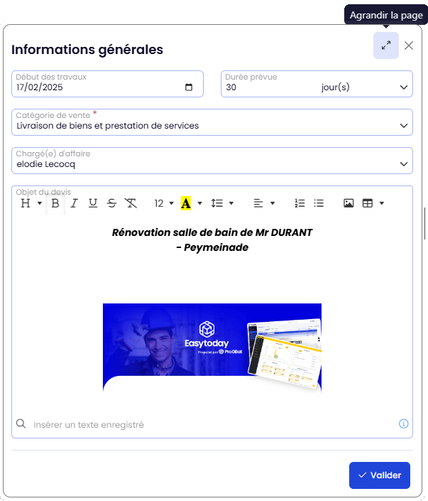 Cet espace vous permet de saisir simplement quelques mots pour présenter le devis, mais aussi un courrier, ou pourquoi pas un page de garde en le terminant par un saut de page.