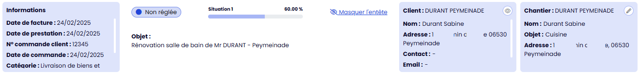 L'entête de la facture regroupe toutes les informations relative au document, au client, et au chantier.