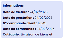 Ce cadre regroupe les informations de la facture, dont certaines sont obligatoires (France).