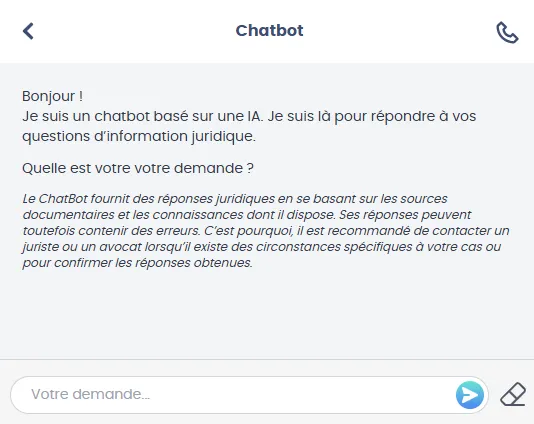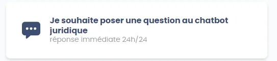 Obtenez une réponse à toutes vos questions juridiques et administrative. Le ChatBot IA répond à toutes vos questions juridique 24h/24, 7j/7. Les juristes vous informent et vous orientent sur les démarches à entreprendre.