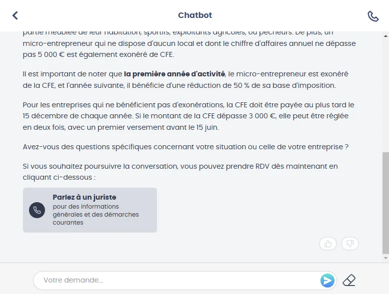 3/ Le chat bot vous répond et vous propose de contacter un juriste si nécessaire