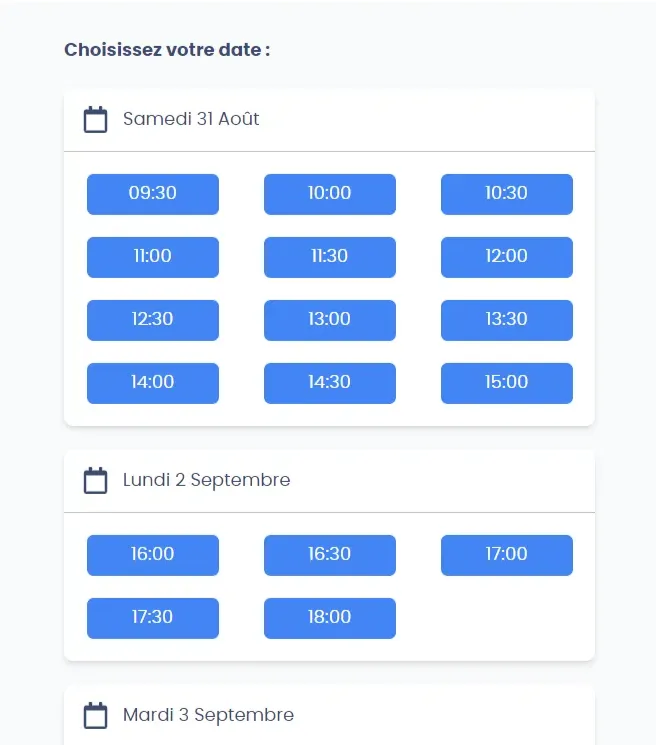 4/ Choisissez la date et l’heure de votre rendez-vous parmi les créneaux disponibles.