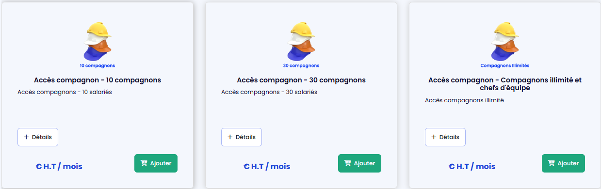 - Ajoutez l'option "30 compagnons" au panier pour permettre à 30 compagnons d'utiliser l'application mobile de saisie des heures