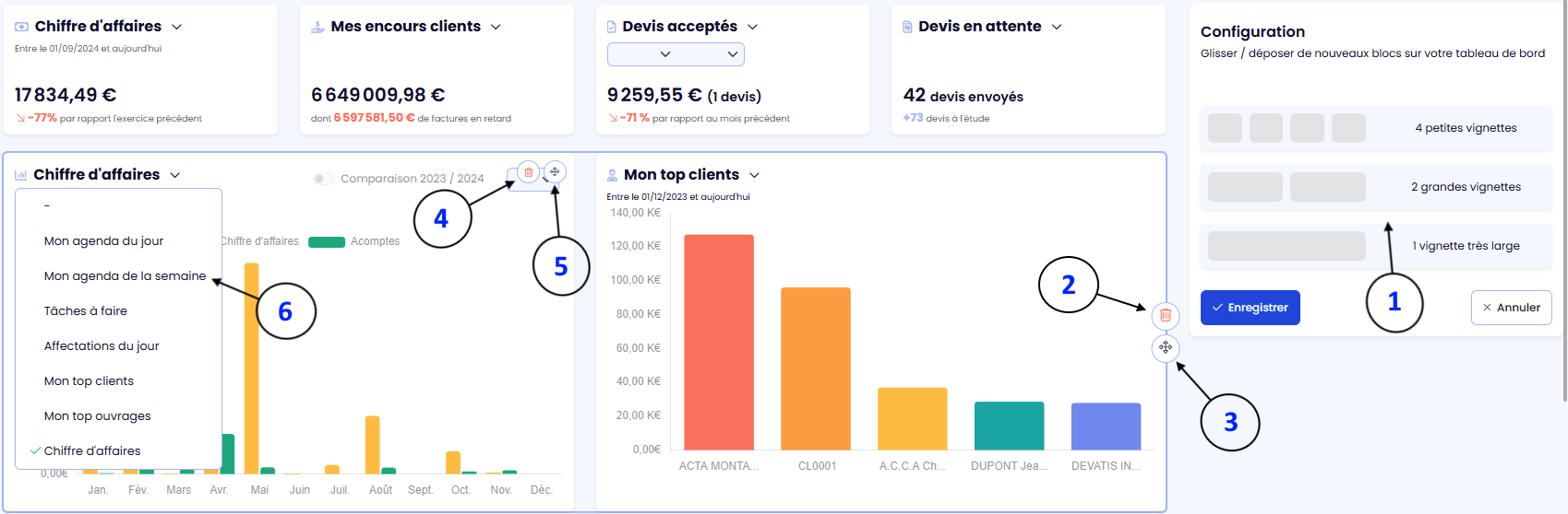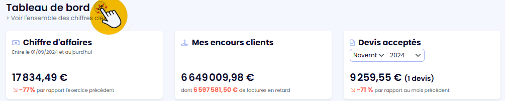 Le tableau de bord est une page affichant des chiffres clés, des graphiques, des listes, pour avoir immédiatement sous les yeux les indicateurs qui vous semblent essentiels pour votre activité.