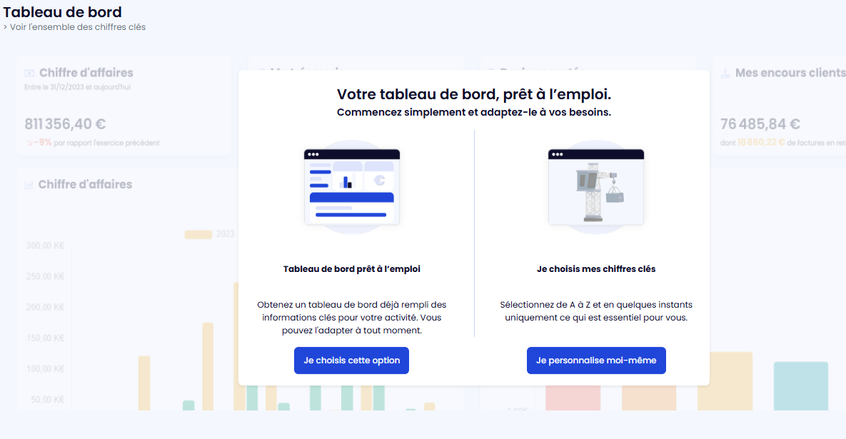 A la première connexion, le logiciel vous propose de choisir entre un tableau de bord "prêt à l'emploi", et un tableau de bord à personnaliser totalement selon vos envies