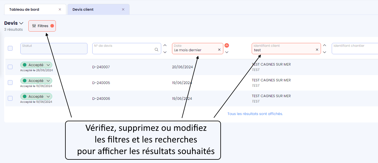 💡Chaque utilisateur dispose de ses propres filtres et recherches. En modifiant les filtres et les recherches sur votre liste de devis par exemple, vous ne modifiez pas les filtres et recherches des autres utilisateurs.